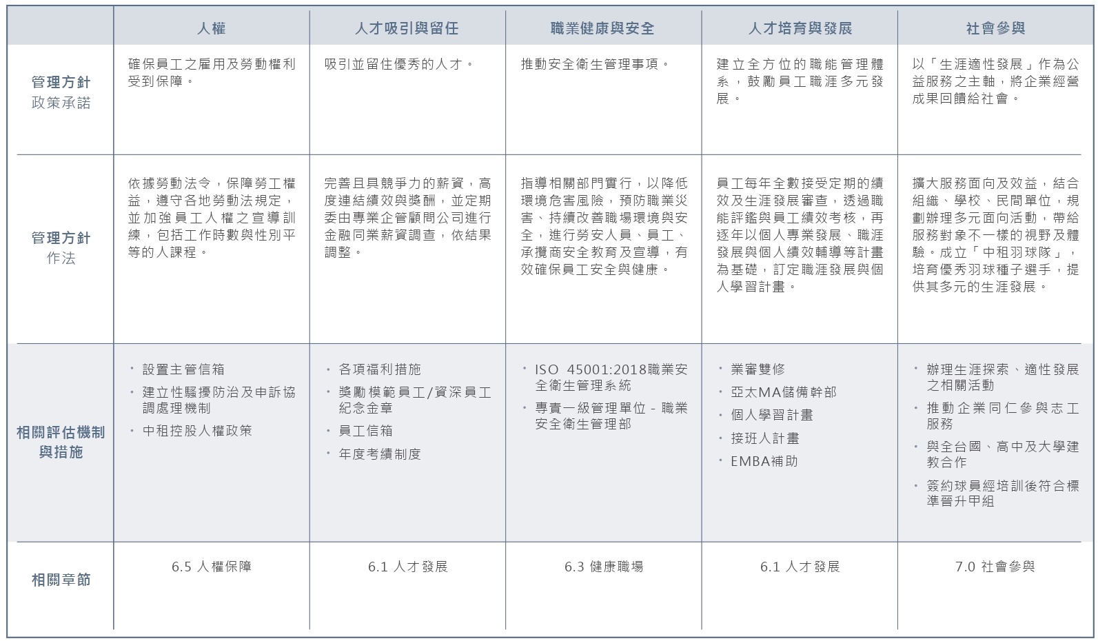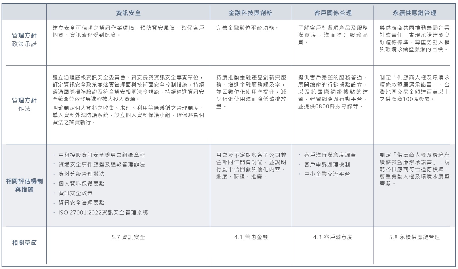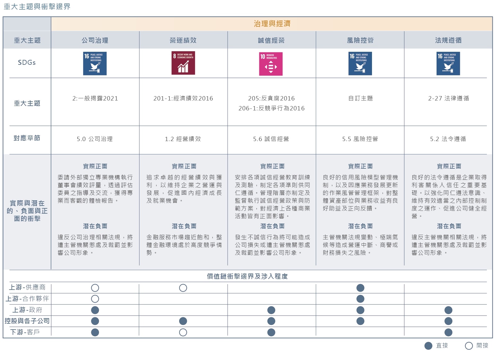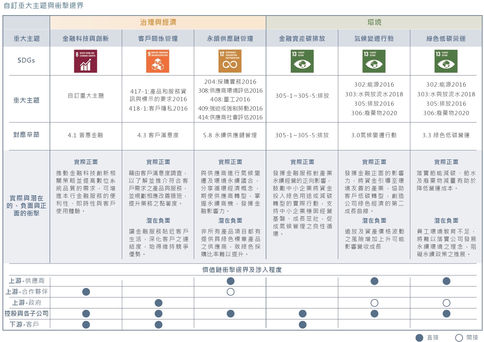 中租控股自2013年發行《企業社會責任報吿書》以來,利害關係人之意見即為公司訂定永續發展策略之指導方針,透過蒐集利害關係人所關注之經濟、環境(e)、社會(s)與治理(g)相關議題的過程,瞭解其對永續資訊關切之主題及面向。同時,我們也參酌國際永續標準與規範如gri準則、sdgs;永續評比如djsi、msci esg ratings指標,並加上中租控股之企業永續發展策略,做為重大性分析之基礎,據以辨識出公司治理、環境永續、社會公益、幸福職場等面向共計5項重大主題,將其內化為企業風險管理(erm)與永續經營的目標,並作為撰寫報吿書之基礎。利害關係人議合結果會呈報至永續經營委員會及董事會。