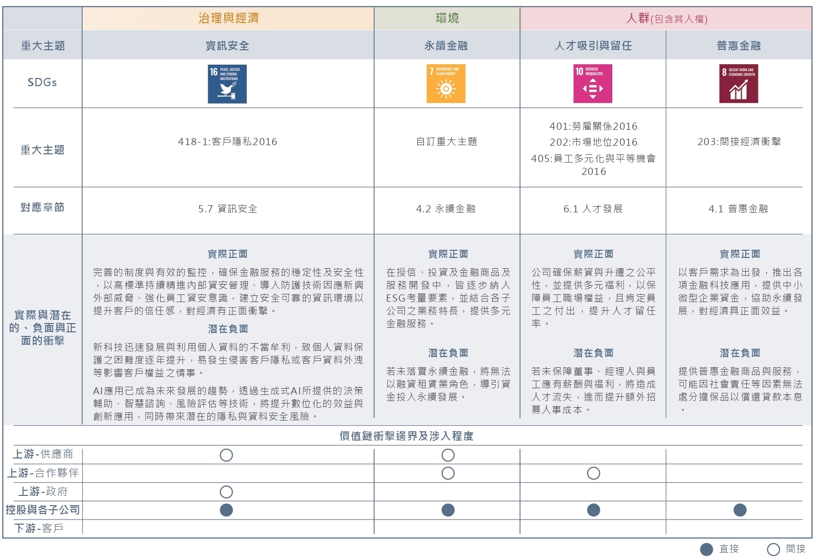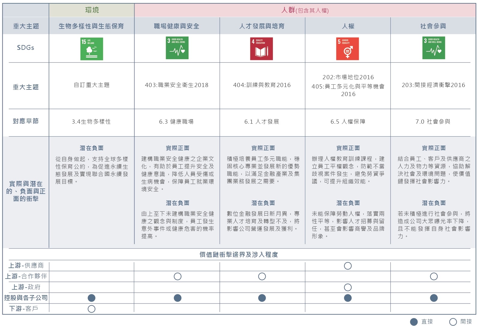 為更準確掌握利害關係人所評估衝擊的議題與中租控股的連結性,採用「雙重重大性」(double materiality)原則進行永續議題重大性分析,並依循gri 3:重大主題 2021,邀請內部高階管理層評估永續議題實際和潛在的正、負面衝擊程度。最後依據利害關係人關注程度及永續議題衝擊程度調查結果,經內部分別針對永續議題之「影響重大性」與「財務重大性」討論,若永續議題具任一重大性即鑑別為重大議題。2023年之重大主題「人權」、「金融資產碳排放」、「生物多樣性與生態保育」三項,經重大主題評選與判定,2024年改為自訂重大主題。