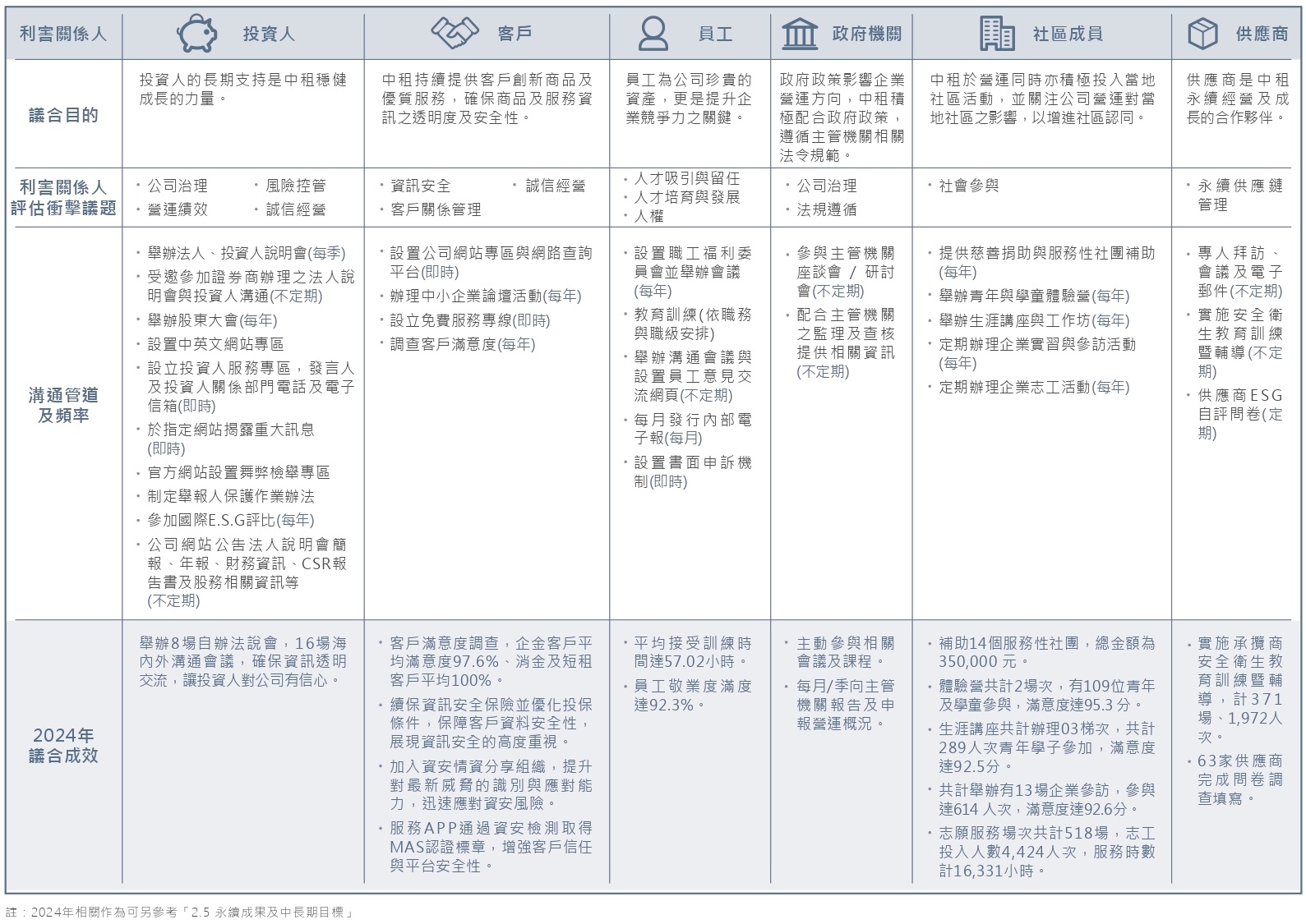 因產業變動性不大,故利害關係人鑑別延用去年結果。主要的利害關係人,分別為投資人、客戶、員工、政府機關、社區成員、供應商。我們除了透過企業官方網站、年報與永續報告書等資訊,經常性公開企業營運績效、環境治理與社會公益等內容,以促進資訊流通的可及性、透明性、互動性與完整性,並由此參考各界回饋意見,作為持續改善的依據。