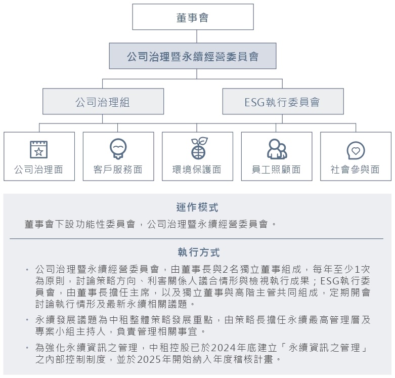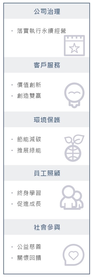 「公司治理暨永續經營委員會」,協助將永續發展融入公司經營策略,作業執行分為五大面向,負責企業永續年度計畫及策略方向之審定,及各項永續執行方案之督導與成效檢討,並定期將執行成果向董事會報告。