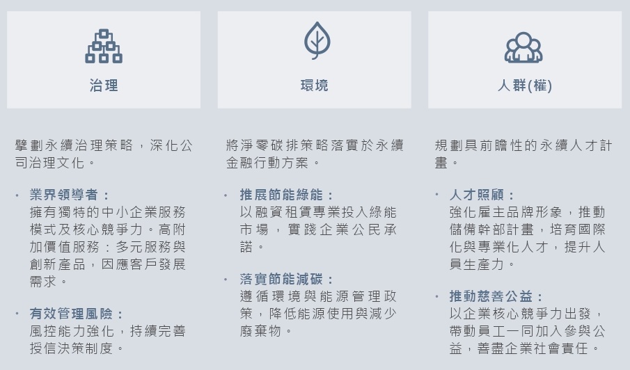 中租控股及旗下子公司長期以多元化、多面向的方式實踐永續發展的理念,追求永續經營與獲利的同時,促進經濟、社會與環境生態之平衡及永續發展,並納入公司管理與營運。永續發展政策的精神理念與推行作為,以企業理念「價值、成長、誠信、紀律」為原則基礎,延伸深化為「公司治理-落實執行永續經營」、「客戶服務-價值創新創造雙贏」、「員工照顧-終身學習促進成長」、「環境保護-節能減碳推展綠能」、「社會參與-公益慈善關懷回饋」。