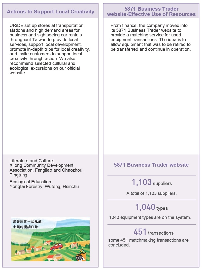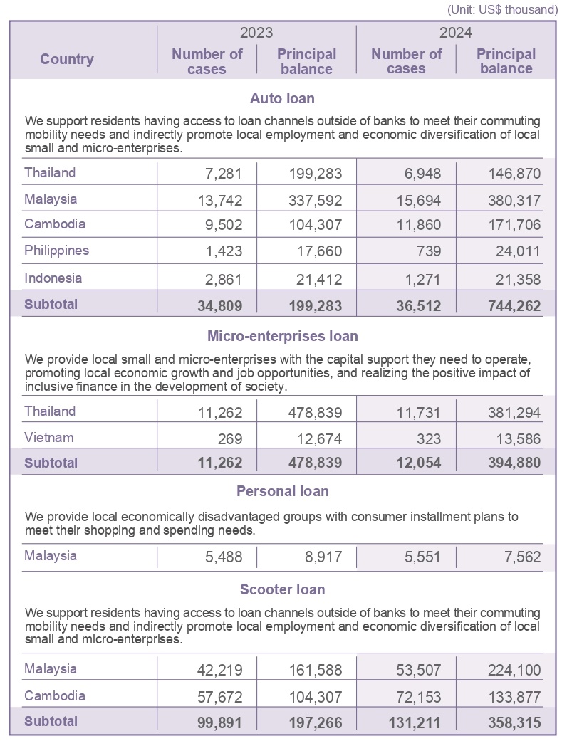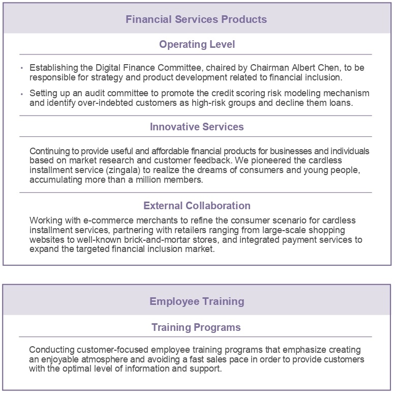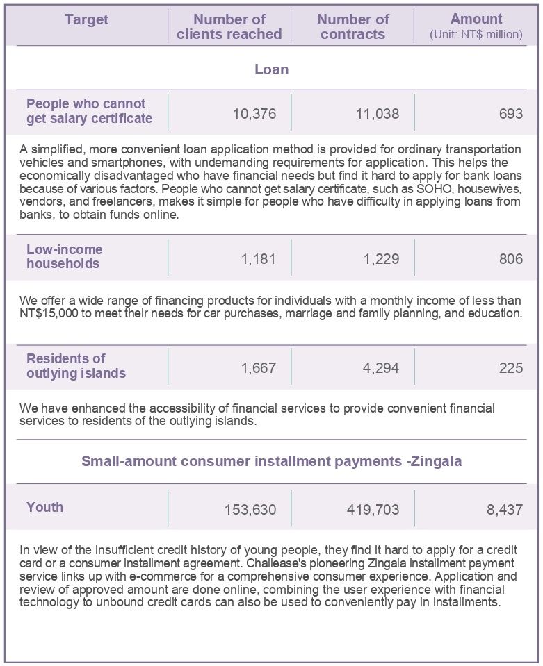 in line with the united nations’ goal of promoting financial inclusion for disadvantaged groups and remote areas to pchailease formulated " financial inclusion policy", committed to actively innovating and expanding the accessibility and use of financial services, and launch tailor-made financial products and services that meet the needs of all sectors of society or different ethnic groups. we exert our financial influence to ensure that all social classes and groups can enjoy fair and reasonable financial services or resources. we also indirectly contribute to increasing the employment rate and enhancing the quality of life for disadvantaged groups.the following examples illustrate the aspects that have been implemented: