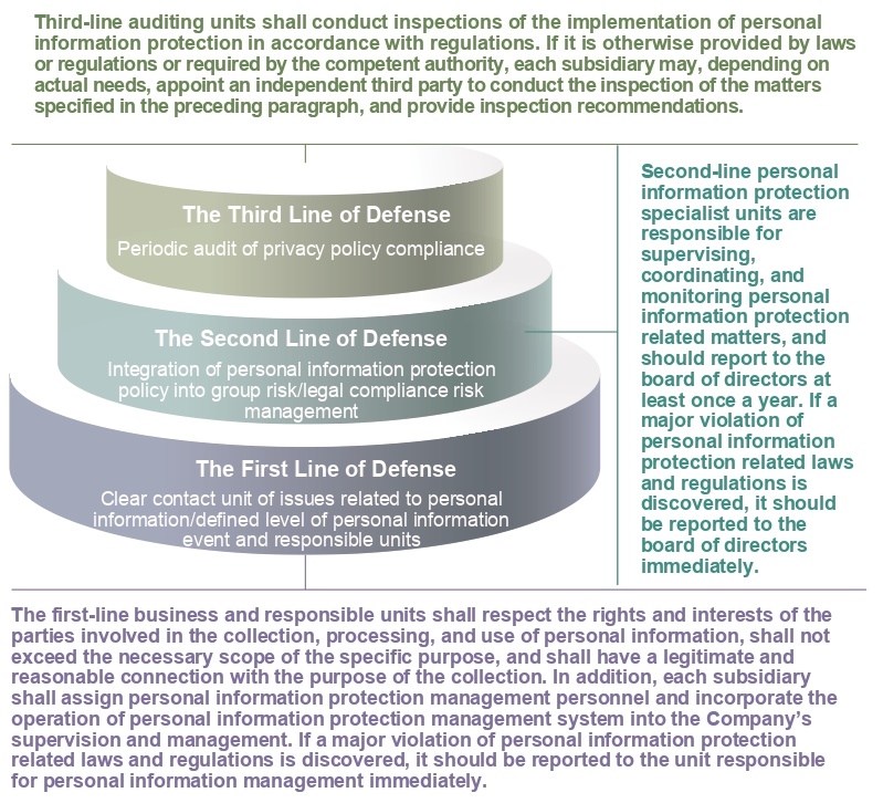regarding the protection of personal information, the company has three lines of defense controls to ensure that the collection, processing or utilization of personal information complies with external laws and internal regulations: