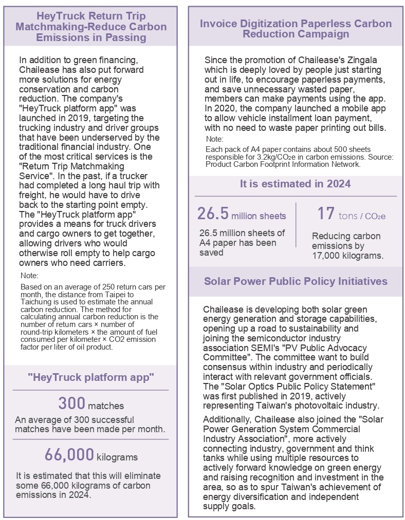 in 2024, chailease participated in more than one hundred financial leases and installment projects for energy-saving equipment financing projects (such as leds, cloud-based energy-saving controllers, power savers, solar photovoltaic modules, optical energy-saving fluorescent lamps, inverters, and other equipment),with a total amount financed of over nt$570 million. in addition to contributing to environmental protection, corporate social responsibility and green energy products, this also brings long-term, stable performance and benefits to the company. in the future, we will continue to replicate taiwan's successful experience, and develop more overseas markets.