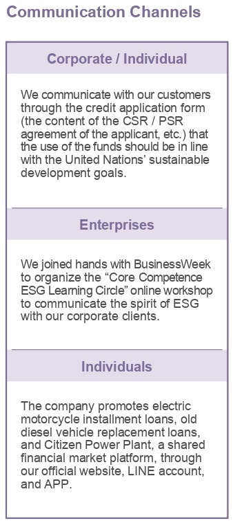 starting in 2023, we included in our credit applications a statement of our commitment to un sustainability goals. we communicate with our customers to promote sustainable development, and agree to respond to the united nations’ sustainable development goals. as we pursue growth, we take into account sustainable development, corporate governance, and the implementation of corporate social responsibility/personal social responsibility, and review the effectiveness of implementation and continuous improvement at all times. we aim to have 100% of our customers completing credit applications from the fourth quarter of 2023 onwards and declare that they have read the above statement of our commitment to the united nations’ sustainability goals. in order to monitor customer risk cases, the corporate finance credit business has added esg risk review to the kyc process (see below)