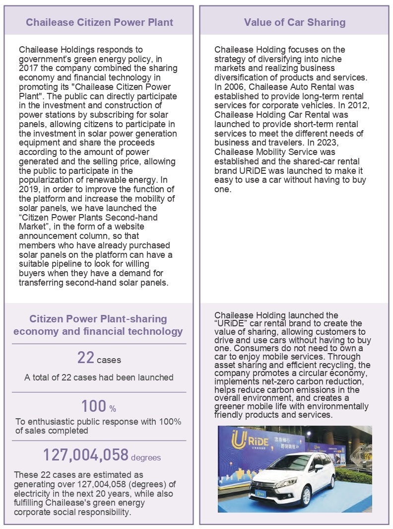 chailease formulates "sustainable financial policy" to fully cover corporate consumer finance business, involved in corporate finance, investment business and retail banking, and has established a comprehensive monitoring mechanism for credit recipients, organized a risk management committee to formulate risk polices, and set up a review committee to do credit checks and verifications before lending. evaluation mechanisms have been enhanced, and credit quality control implemented. to fulfill corporate social responsibilities while considering the interests of customers and shareholders as well as financial sustainability, chailease added esg factors to its credit evaluation process requiring credit companies to assume responsibility for employees, society and the environment. they must also abide by corporate ethics, respect employee rights and care, and prioritize environmental protection. the company is committed to reducing esg risk to enhance the value of its long-term corporate investment/loans. chailease also actively promotes green energy development, environmental carbon reduction and increased employment rate to promote sustainable economic growth and social development.
