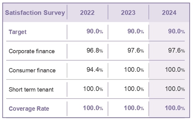 in 2024, a customer satisfaction survey was conducted covering all major products, with a total of over 4,000 questionnaires collected. using the quantitative conversion mechanism of indicator satisfaction, the average overall satisfaction rate of corporate finance customers was 97.6%, the average overall satisfaction rate of consumer finance (zingala card) customers was 100%, and the average overall satisfaction rate of short term tenant customers was 100% in 2024. the overall satisfaction rate of customers with the company’s services exceeded the set target, reaching over 90%.