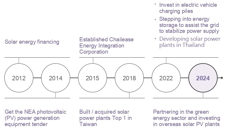 chailease's core competitiveness is the basis for its product "innovation". at the same time, the company takes corporate social responsibility into account, opening up green markets and establishing the green competitiveness of the enterprise. in 2015, chailease energy integration corporation was born. the company provides customers with energy-saving services and helps enterprises to fulfill their social responsibilities in the areas of green energy and environmental protection. in 2014, the company won a moea bureau of energy bid for solar photovoltaic power generation equipment, and we successfully bid for two solar power plants located in alien district, kaohsiung; and by october 2014, we acquired 71 solar power plants from yun tang inc., which were previously owned and operated by ngp, a subsidiary of neo solar power corp. for nt$445 million. since then, we have built and acquired a large number of solar power plants. in 2018, held 1,000 such plants. this makes chailease the company in taiwan with the most solar power plants. we expanded to thailand in 2022 and strategically allied with green energy industry companies to jointly invest in overseas photovoltaic projects in 2024.
