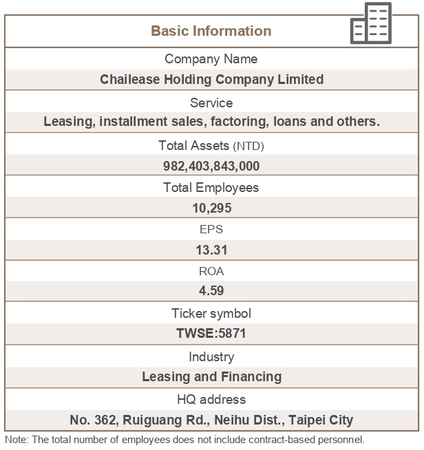 chailease holding's vision is to become the "the best financial services company in the asia pacific area". the company is committed to being "a supporting partner of our customers, a driving force of economic success ", and continually seeks "value, growth, trust, and discipline" in its corporate culture.