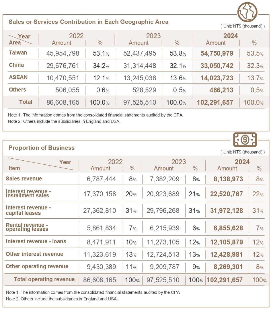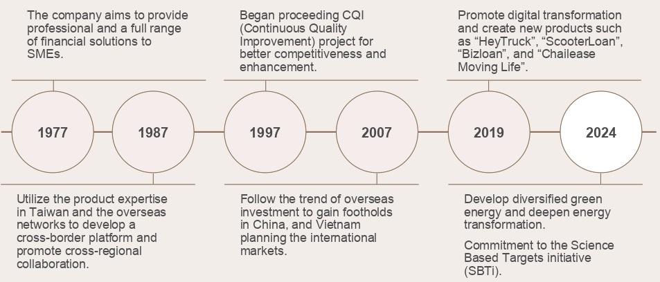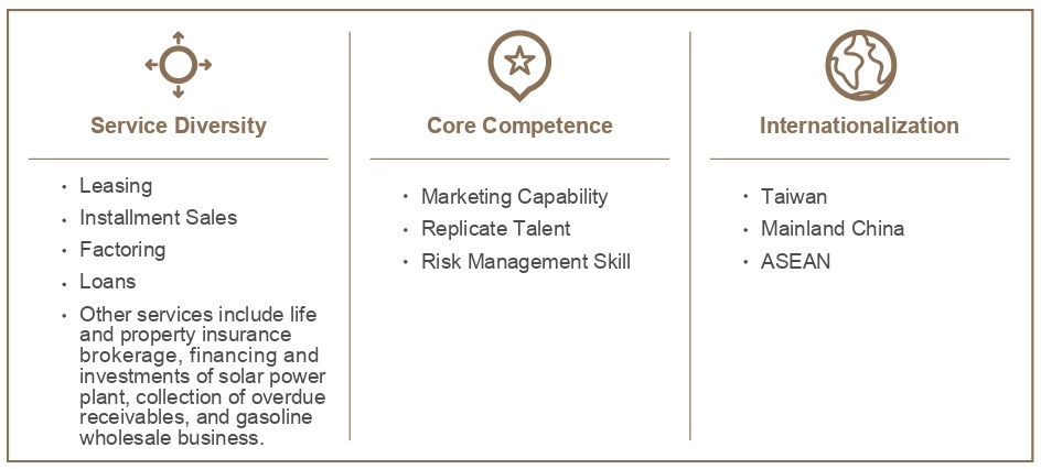we constantly strive to for growth in "quality" and "quantity" within the company. our niche market is small and medium-sized enterprises, for whom we provide diversified products and services, satisfying their needs. starting from traditional leasing installment services, the company has developed many and diversified commercial products. in addition to traditional leasing, installment payments and accounts receivable services, the company has expanded into heavy vehicle financing, passenger vehicle financing, fishing commodity financing, micro-business financing, real estate financing, automobile leasing, energy conservation project financing, stock financing, and insurance agency.