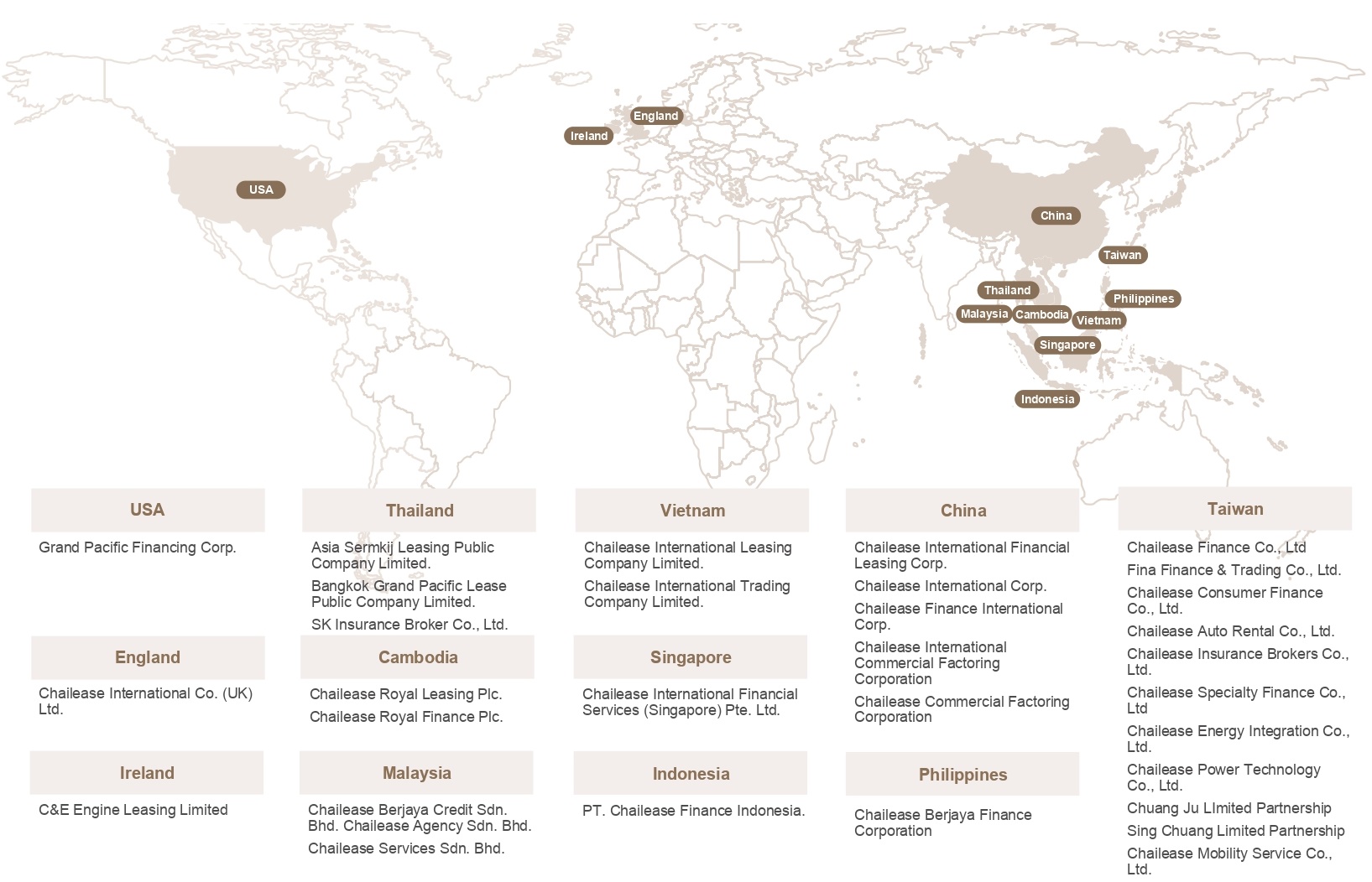in 1977, our first operating entity, china leasing company limited, commenced business in taiwan. in addition to traditional leasing, installment sales and factoring services, the company successfully developed new financial products to cope with smes' funding needs for their diverse business development. including heavy vehicle and automobile financing, construction equipment financing, fishery inventory financing, micro-enterprises financing, non-performing assets auction, real estate financing, office equipment leasing, medical equipment financing, car rentals, esco financing and services, solar power plant financing and investment, inventory financing (including cross-border), aircraft and ship financing, gasoline wholesale business, and insurance brokerage. we currently have operations in taiwan, prc, thailand, vietnam, malaysia, cambodia, philippines and indonesia. there are no significant differences between the 2024 supply chain and that of 2023.