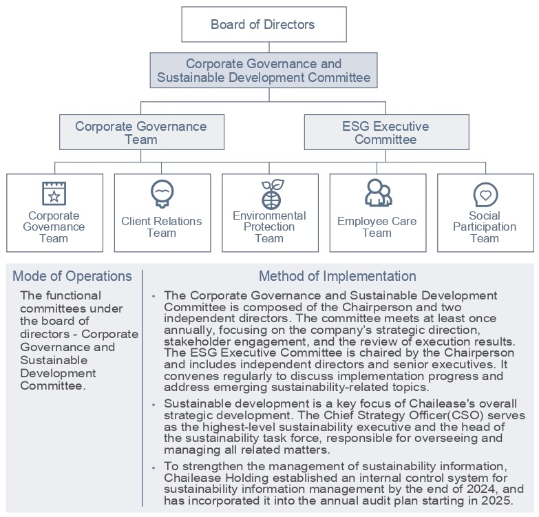 chailease set up the corporate governance and ethics committee in 2016, two years after establishing the csr committee in 2014. oversight over the past few years has brought significant progress and benefits. to meet external legal requirements and additional needs discovered during this oversight, in 2018 the company moved the corporate governance and ethics committee up the organizational hierarchy directly under the board of directors and renamed it the corporate governance and sustainable development committee (hereinafter referred to as “the committee”). the corporate governance team and the esg team were established under the committee in 2020. in order to fulfill our corporate social responsibility, improve effectiveness of corporate governance efforts and to achieve integrity management, results of this implementation are reported to the board at least once each year so that sustainable development becomes part of the fabric of company business strategy. in 2023, the esg team upgraded to the esg executive committee, which consists of independent directors and senior managements.
