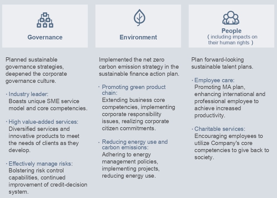 chailease holding and its subsidairies are continuing to promote the sustainable development of the economy, society and environment in diversified way and incorporate it into the company's management and operations as we strive to achieve continuous business development. the spirit and implementation of the sustainable development policy are based on the corporate philosophy of “value, growth, trust, and discipline”, and are further deepened into “corporate governance—implementing sustainable management”, “customer service—value innovation, creating a win-win situation” , “employee care—lifelong learning and encourage growth”, “environmental protection—conserve energy to reduce carbon emission and promote green energy”, “social participation—charity and contribute to society”.