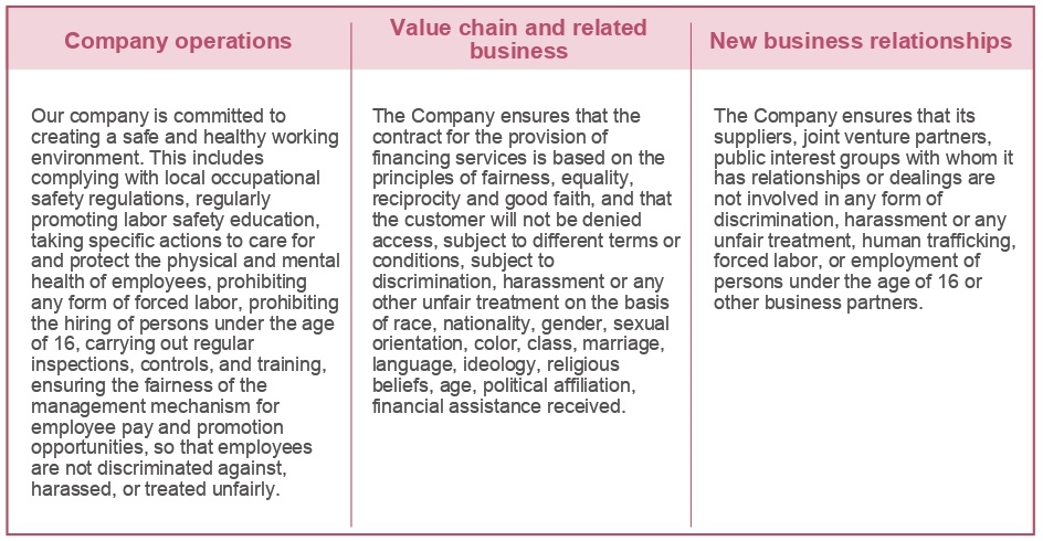chailease holding conducts human rights due diligence in accordance with the human rights policy approved by the board of directors. chailease holding adopts systematic approaches to identify the potential risk of human rights violations which might interfere with the business. all chailease holding’s subsidiaries are required to include human rights norms in their regular risk assessment and to apply them in line with a risk-based approach. in 2020, chailease holding developed a human rights due diligence process to identify critical suppliers with a high potential for human rights violations.