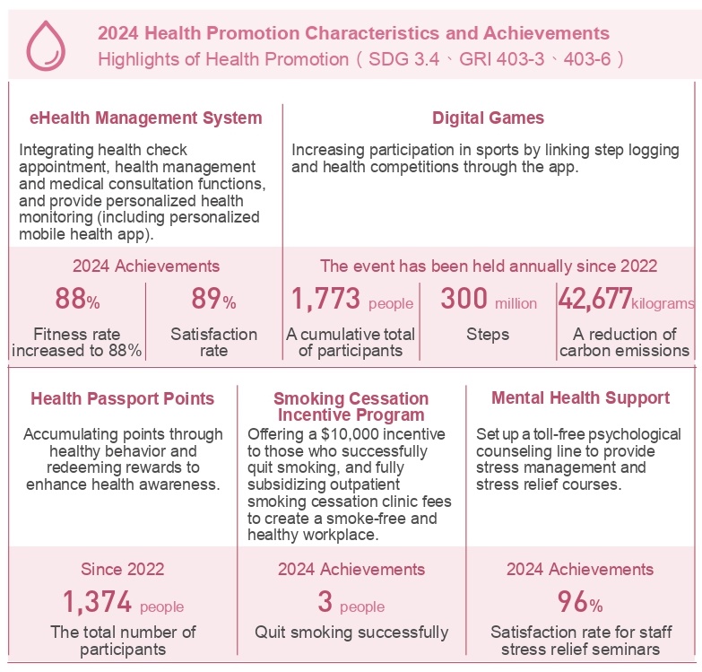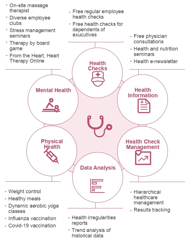 chailease holding continues to create and organize a friendly and healthy workplace, treating employees as the company's most important asset. senior managers highly support various health promotion activities, setting up a team of professional doctors and nurse practitioners to take care of employee health, and annually planning a health promotion plan based on employee health data classification, health risks, and the results of the employee health questionnaire, and adopting the pdca health management mechanism to enhance the effectiveness of health management through the cycle of planning, execution, review, and improvement (pdca), we adopted the pdca health management mechanism to enhance the effectiveness of health management through the planning, execution, review, and improvement cycle.