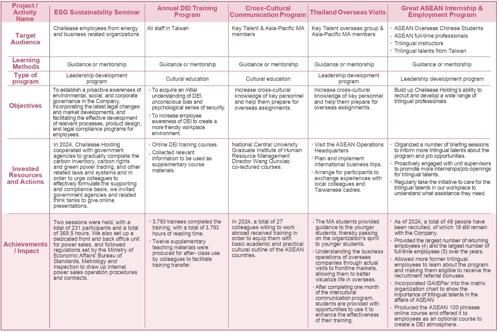 in the company’s successor cultivation plan, talent development programs are divided into four types: the management associate program, chailease talent development program, international talent program, and new york university training program. each program is designed for specific types of candidates and has specific objectives, so that we can maximize our competitiveness over the next decade through the development of talents.