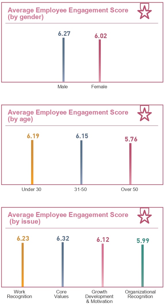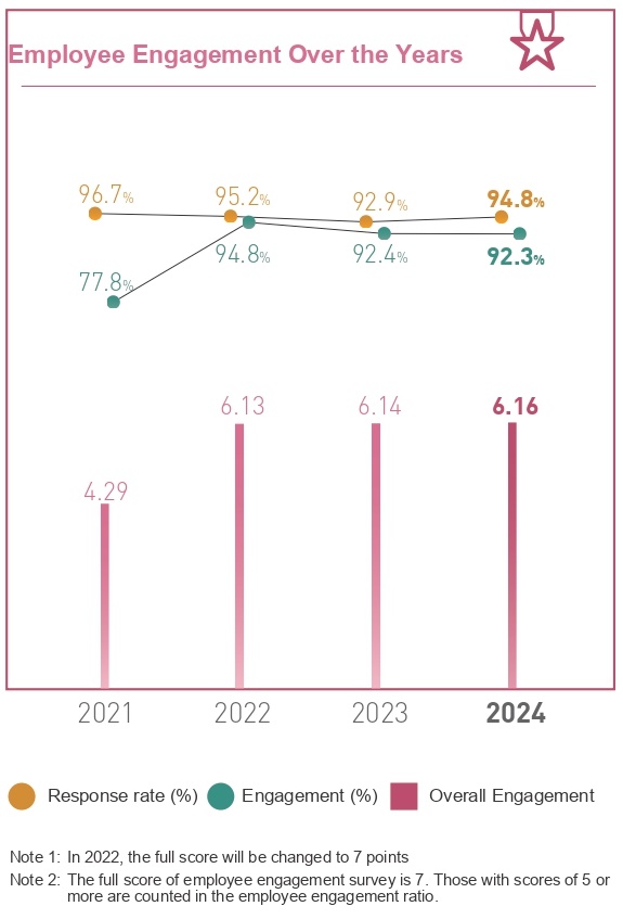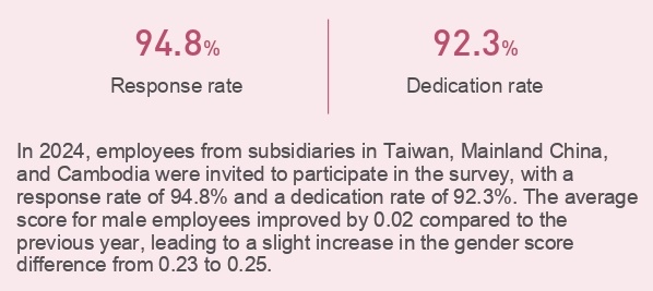 to understand employees' job satisfaction, sense of purpose, happiness and work stress, the new employee engagement survey from 2020 covered four areas: work recognition, core values, growth development and motivation, and organizational recognition. in 2024, employees from subsidiaries in taiwan, mainland china, and cambodia were invited to participate in the survey, with a response rate of 94.8% and a dedication rate of 92.3%. the average score for male employees improved by 0.02 compared to the previous year, leading to a slight increase in the gender score difference from 0.23 to 0.25.