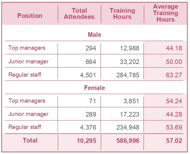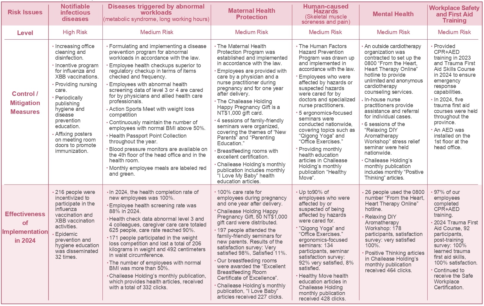 in order to enhance each employee's knowledge of occupational safety and health related laws and regulations and the company's safety and health management mechanisms, we refined the safety and health education and training courses by adding online courses to the original physical courses to enhance the learning and training effects and create a culture and concept of safety, health and wellness. the new online courses include: introduction to occupational safety and health law, maternal health protection & overload & human hazard prevention, cpr & aed first aid training, fire prevention and response, gender equality awareness in the workplace, prevention of unlawful assault and other related education and training courses.