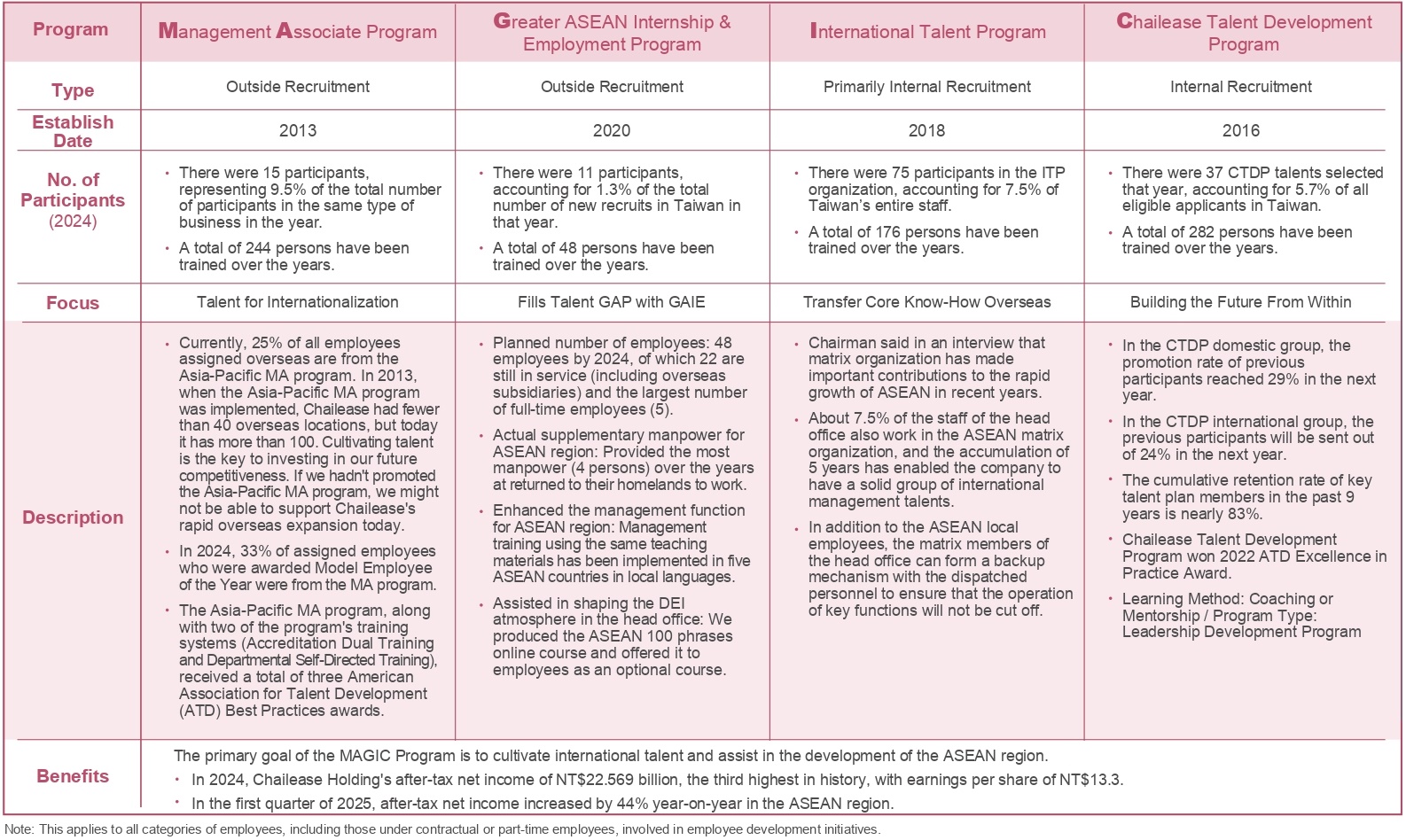 since 2019, chailease holdings has launched the golden ten year plan, aiming to significantly increase the total assets of taiwan, china and asean in 2028, expecting the operating scale in 2028 to be 4 times larger than that in 2018, and making asean the third profit engine of asean, which is a very ambitious goal. in order to support the rapid development of the organization, the talent development department has created the magic talent brand since 2021, which is composed of the following four talent development sub-programs (please see the table below). since each program has a focus on development, magic's brand slogan is: focus makes magic, emphasizing that only by focusing can we create magic. chailease received the american association for talent development (atd) 2025 best award for excellence in learning organizations for its magic program.