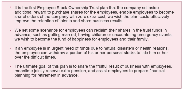 chailease immediately promoted employee stock ownership trust plan in 2012, after its ipo in the end of 2011. employees with sufficient rank and performance evaluations will be allocated a fixed incentive every month according to the operating results of the current year. the amount will be deposited into the employees' trust account on a regular basis. employees can be shareholders of the company without contributing any capital. employees who do not contribute can also share in company profits in the form of an equivalent bonus awarded on top of regular salary. in september 2022, the employee stock ownership trust plan was expanded to cover all full-time employees in taiwan, regardless of their rank. the coverage rate is greater than 90%. moreover, incentive amounts will increase as we continue to invest nt$100 million annually. in addition to receiving the full amount upon retirement, employees can also directly receive cash dividends from the annual stock distribution. stock dividends that are credited to the trust account will create a long-term appreciation effect. employees can keep track of trust assets through the online trust platform and company email notifications.