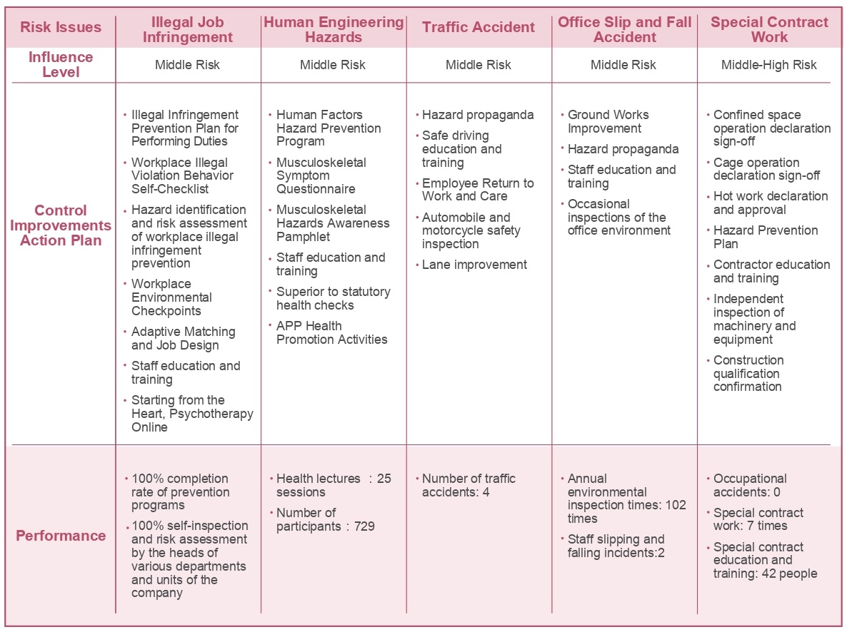 in addition, in order to prevent occupational hazards, we have implemented procurement management, contracting management, and change management at the source, considered occupational safety and health to reduce risks before procurement and change, and implemented hazard factor notification and safety and health education training when contracting.