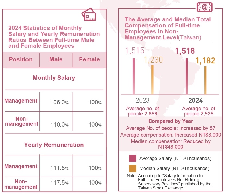 we offer complete and competitive salary packages and performance-linked bonuses. moreover, we regularly commission a professional management consulting company to conduct financial industry salary surveys and we adjust salaries accordingly to ensure the company offers compensation that is appropriate or exceeds the estimated cost of living. for example, according to one report, our new hires with two areas of specialization earned approximately 1.56 times the average basic monthly salary. (there is no gender difference in initial emolument) chailease holding ensures fairness in the management of employee pay and promotion opportunities, and ensures that employees are not subjected to any discrimination, harassment, or any unfair treatment on the basis of race, national origin, gender, sexual orientation, color, class, marriage, language, ideology, religious beliefs, age, political affiliation, financial assistance received, or any other characteristic.