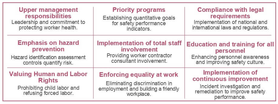 the occupational safety and health department’s duties include formulating, planing and promoting occupational safety and health management measures and assisting relevant departments in their implementation to reduce risks from environmental hazards, prevent workplace accidents, and continually improve workplace environment and safety. the department is also responsible for promoting safety education among labor safety staff, employees and contractors. these measures will help ensure the safety and health of our employees.