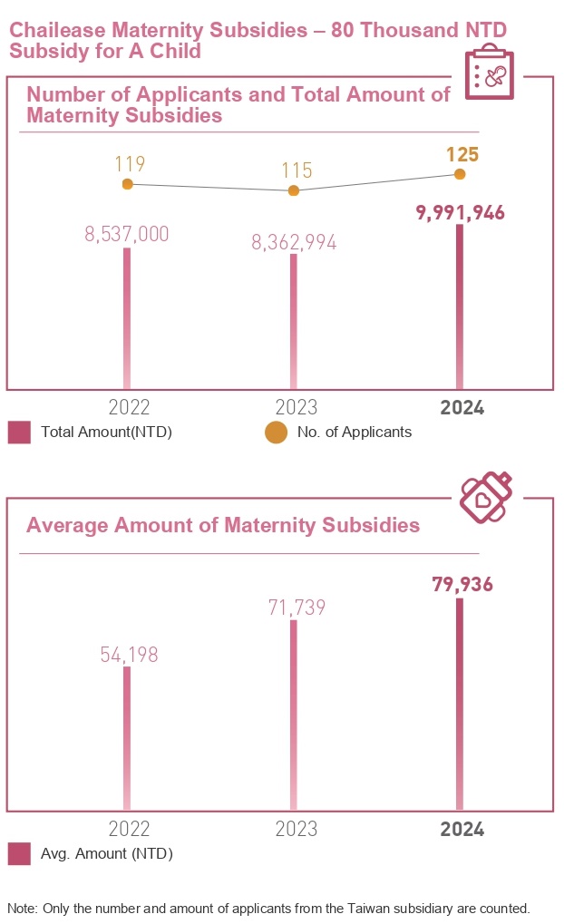 beginning in june 2024, we steadily increased our maternity bonuses and subsidies to encourage our employees to plan for their children and to provide more support for families as a way to show that we value the growth of the family. chailease holding provides leave days that are superior to those required by law for maternity, paternity, paternity and pregnancy tests, so that employees (including the lgbtq community) can rest assured at these important times, focus on their families and find the best balance between work and family responsibilities. this is a gesture of care and support for diverse families, so that every employee can feel the company's tolerance and concern.