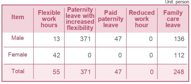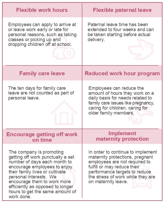 flexible work hours—employees can apply to arrive at or leave work early or late for personal reasons, such as taking classes or picking up and dropping children off at school. flexible paternal leave—paternal leave time has been extended to four weeks and can be taken starting before actual delivery. family care leave—the ten days for family care leave are not counted as part of personal leave. reduced work hour program—employees can reduce the amount of hours they work on a daily basis for needs related to family care issues like pregnancy, caring for children, caring for older family members. encourage getting off work on time—the company is promoting getting off work punctually a set number of days each month to encourage employees to enjoy their family lives or cultivate personal interests. we encourage them to work more efficiently as opposed to longer hours to get the same amount of work done. in addition, in order to continue to implement maternity protections, pregnant employees are not required to fulfill or may reduce their performance targets to reduce the stress of work while they are on maternity leave.