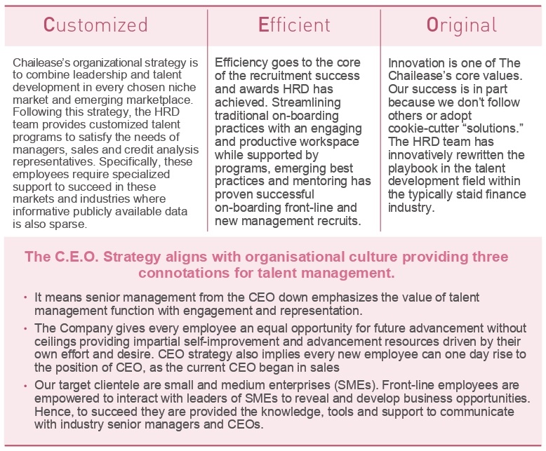 to effectively support and solve business needs in the hypercompetitive finance industry, innovative means to attract, support, develop and maintain talent is required to survive and thrive. the chailease hrd culture of innovation is guided by our c.e.o. strategy of customised efficient original program development.