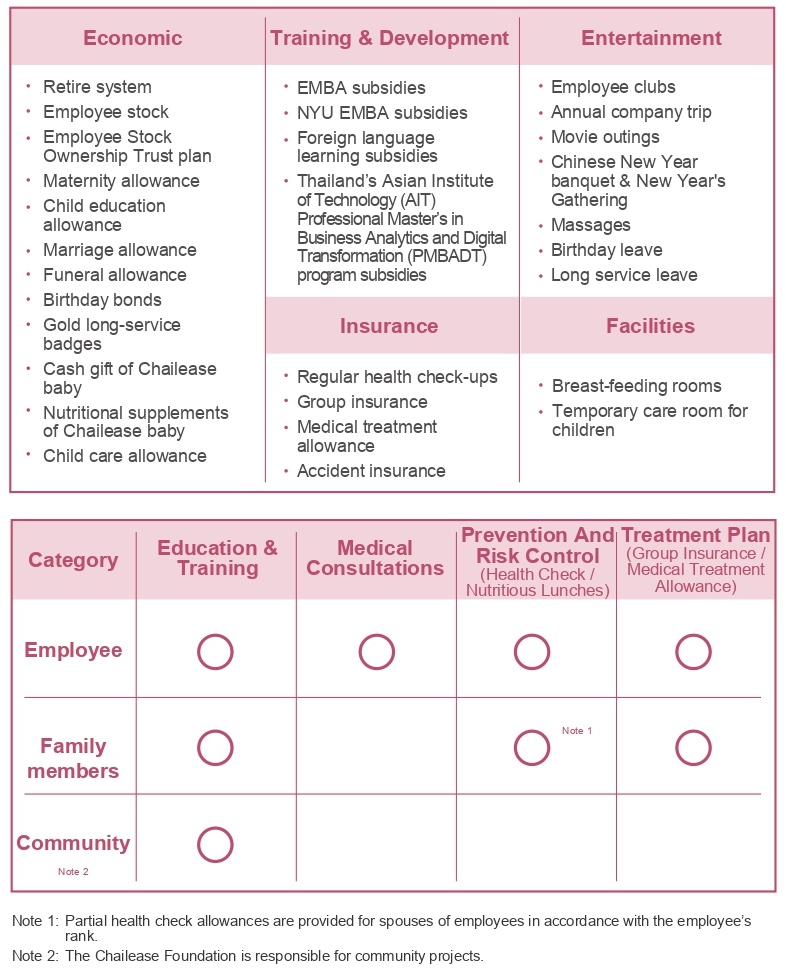 in terms of employee welfare, our taiwan subsidiary has launched a market-leading group insurance program that covers not only the employees themselves, but also their parents and children, demonstrating our care for their families. meanwhile, our 24/7 employee assistance programs (eaps) provide psychological counseling, financial and tax, legal, management and health services, and each employee is entitled to three free one-on-one consultations per year to strengthen their physical and mental health, as well as personal support.