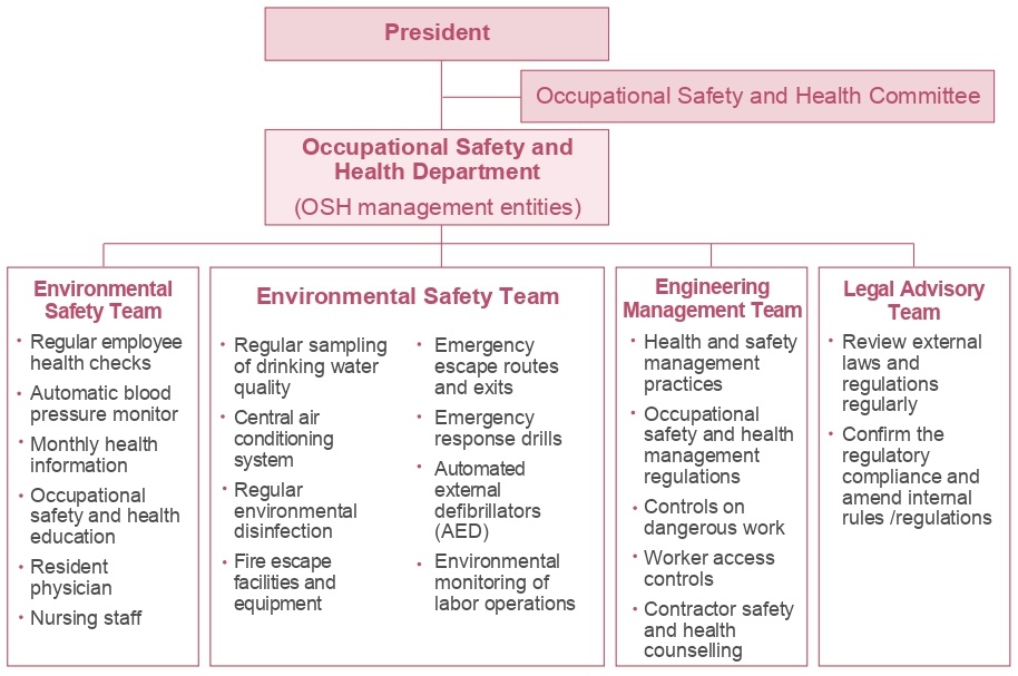 in order to prevent occupational accidents and protect the health and safety of workers, and in accordance with the provisions of the "occupational safety and health law", a full-time management unit - occupational safety and health management department was established, with full-time occupational safety managers and nurses, and the "occupational safety and health law" was established. sanitation management regulations" and the establishment of the "occupational safety and health committee". the number of the committee includes more than one-third of labor representatives (labor representatives’ account for 36% of the committee members). the occupational safety and health committee holds regular meetings every quarter to review occupational safety and health. issues and risk management issues, participants besides labor representatives, department heads at all levels, occupational safety teachers, nurses and top management personnel also participated.