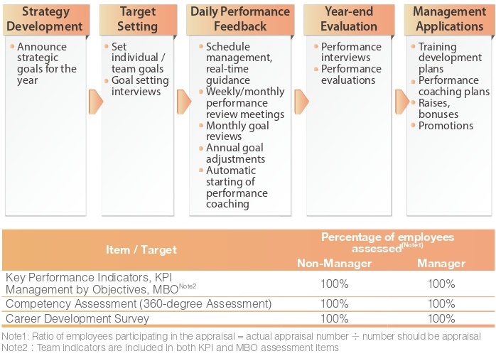 talent cultivation at chailease holdings uses four essential pillars: core skillset training, management skillset training, professional skillset training and digital empowerment training to establish a complete education and training network together with a strict performance management system. every year, 100% of our employees participate in regular performance evaluations and career development questionnaires. functional evaluations and employee performance reviews that reflect the annual development and team goals of our organization in conjunction with the personal growth plans of our employees are the foundation used to create a comprehensive career development, team performance and individual development plan (idp) for each employee based on gradual annual progress with respect to individual professional development, career development, and personal performance counseling programs. in addition, through schedule management and performance counseling, we provide immediate feedback and guidance to employees on a regular basis, review performance goals on a monthly basis, and conduct year-end evaluations based on goal achievements and work development.